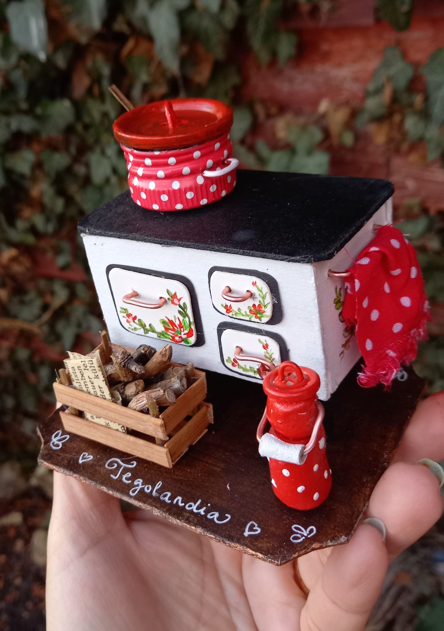 Nem is csoda, hiszen igazi kis műremek – azt is csak később veszem észre, hogy a pöttyös „zománclábasok” fémkupakból (egyébként a Piroska szörp kupakjából) készültek, fedőjük pedig egy régi kabátgomb…