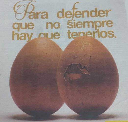 Következő zsákmány: egész oldalon két tojás képe, az egyik héja betörve. A felirat (magyarítva): “Tökösnek kell lenni ahhoz, hogy belásd, nem minden esetben szükséges, hogy tököd legyen”. Alatta apróbetűben ez áll: “a szabadabb, változatosabb és feministább férfiasságért.” Aláírás: a spanyol kormány.