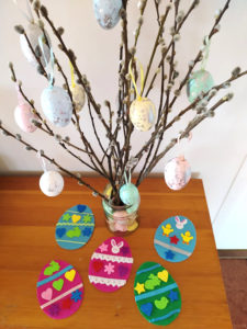 Ezután a gyerekek már tetszőlegesen alkothatnak a rendelkezésükre álló alapanyagokból, és gyönyörű tojásokat készíthetnek. A középsős gyermekeket közben – játékos módon – már megismertethetjük a szimmetria fogalmával is. Vezessük rá őket, hogy ügyeljenek a színek és/vagy formák egymáshoz illesztésére, hiszen a klasszikus hímes tojás díszítésnek is ez az alapja!