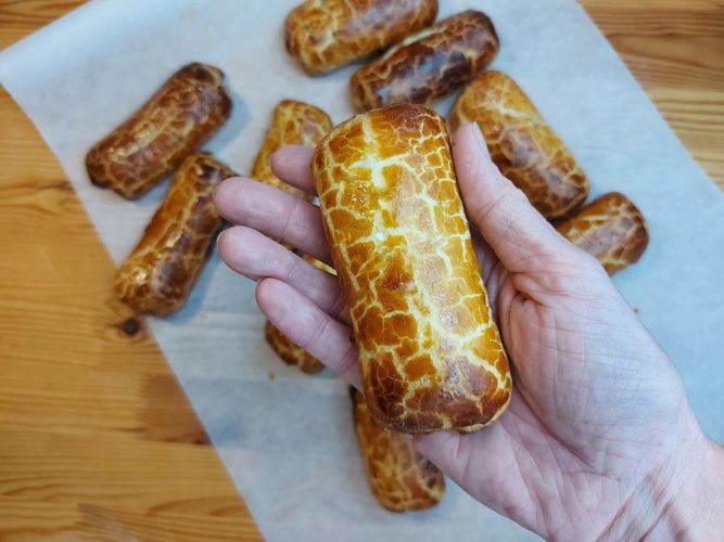 A tészta begyúrását követő nap kiveszem a gombócokat a hűtőből, lazán átgyúrom, majd egyenként kinyújtom őket kb. 50 mm szélességűre. Hogy egyforma téglalapokat kapjunk, bátran lehet a vonalzót mankóként használni. A kinyújtott lapokat gyengéden megkenjük tojásfehérjével, majd rásimítjuk a tölteléket. Kétoldalt kicsit behajtjuk, fentről lefelé feltekerjük.