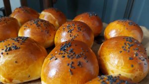 1 tojást szétválasztottam, de csak addig, míg a sárgájában kikevertem egy kiskanál füstölt pirospaprikát. (Jobban feloldódik így a paprika, mintha az egész tojásban kevernénk el.) Egy csipet só került még a tojásba, és miután megkentem vele a bucikat, a kályha melegében újabb 40 percet pihentek. Ezután újabb tojásréteg került a megkelt tésztára, majd fekete szezámmaggal szórtam meg, és 10 perccel később már a 180 fokos sütőben sültek.